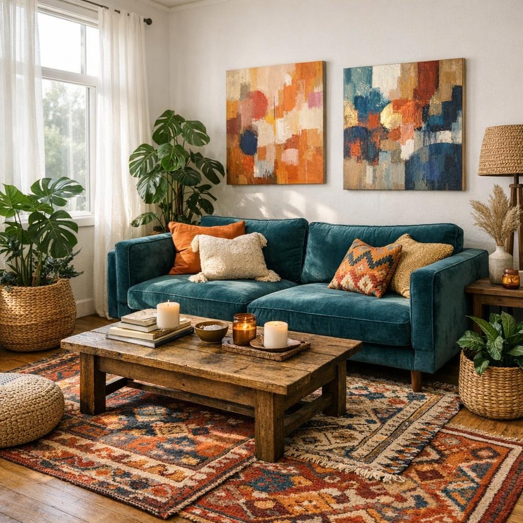 • Setze viele Textilien ein: Teppiche, Kissen, Decken in verschiedenen Texturen.